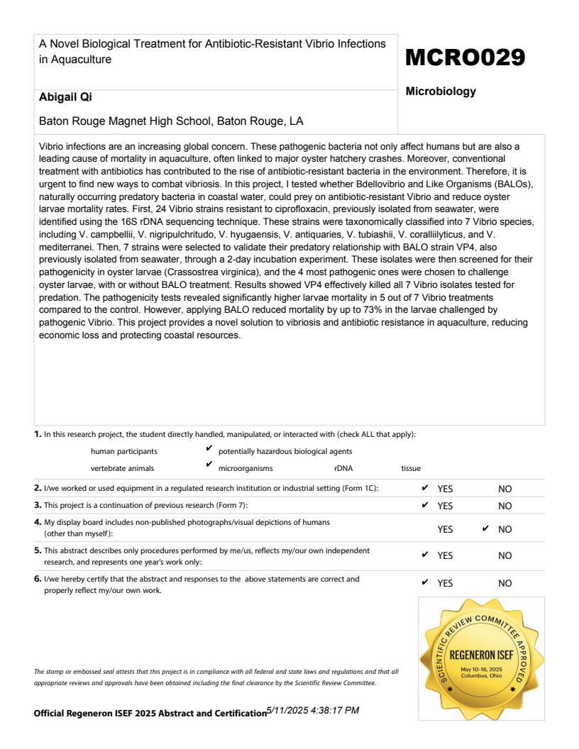弧菌感染日益成为全球关注的焦点。这些致病菌不仅影响人类,也是水产养殖业死亡的主要原因,通常与牡蛎孵化场的重大事故有关。此外,传统的抗生素治疗也导致了环境中抗生素耐药性细菌的增多。因此,迫切需要找到对抗弧菌病的新方法。在本项目中,我测试了蛭弧菌及其类似生物(BALOs),这些天然存在于沿海水域的捕食性细菌,是否能够捕食抗生素耐药性弧菌并降低牡蛎幼虫的死亡率。首先,我利用16S rDNA测序技术鉴定了24株先前从海水中分离出的耐环丙沙星弧菌菌株。这些菌株按分类学分为 7 个弧菌种,包括 V. campbellii、V. nigripulchritudo、V. hyugaensis、V. antiquaries、V. tubiashii、V. coralliilyticus 和 V. mediterranei。然后,选择了 7 个菌株,通过 2 天的孵育实验来验证它们与之前也从海水中分离出来的 BALO 菌株 VP4 的捕食关系。随后,对这些分离株在牡蛎幼虫(Crassostrea virginica)中的致病性进行筛选,并选择 4 个致病性最强的菌株来攻击牡蛎幼虫(使用或不使用 BALO 处理)。结果表明,VP4 可有效杀死所有 7 个用于捕食测试的弧菌分离株。致病性测试表明,在 7 个弧菌处理组中的 5 个幼虫死亡率明显高于对照组。然而,使用BALO技术可将受致病性弧菌感染的幼体死亡率降低高达73%。该项目为水产养殖业弧菌病和抗生素耐药性问题提供了新的解决方案,减少了经济损失,并保护了沿海资源。